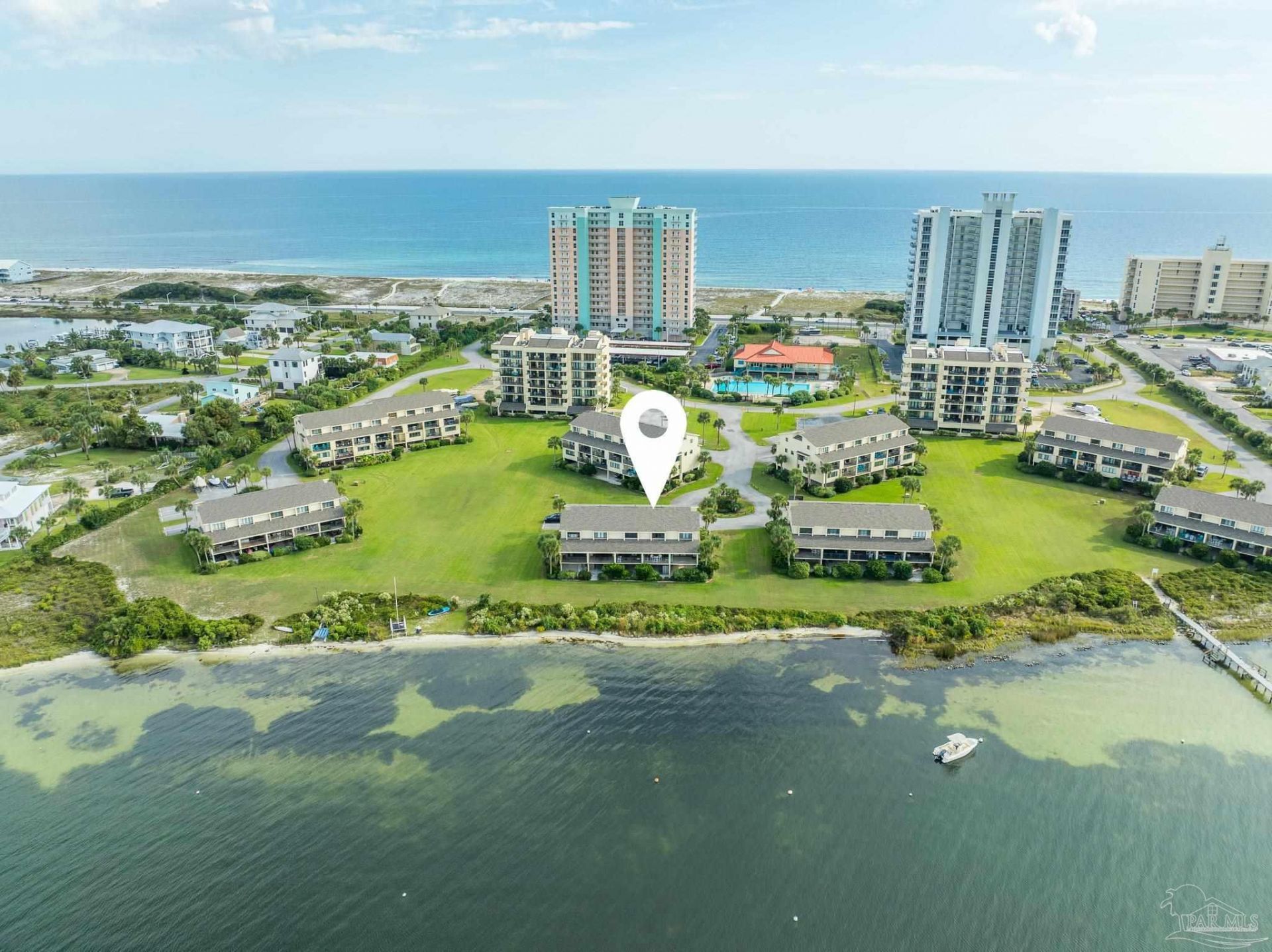 Comfort, style and total relaxation is yours in this perfectly positioned, waterfront, 2 bedroom, 2 ½ bath treasure on award-winning Pensacola Beach. Check out the large covered balcony where you'll enjoy morning coffee or spectacular sunsets while watching the world go by. The main floor features an open-concept layout with a fully equipped kitchen, spacious living area and half bath, ideal for entertaining or just chilling after a day in the sun. Upstairs, you'll find two generously sized bedrooms, each with its own private bath. You'll double your pleasure on the Sound side, enjoying tons of amenities such as a giant pool and clubhouse with work out room, tennis courts, and a dock, knowing you're just steps from the sparkling waters of the Gulf right across the way. Besides the designated parking, you'll relish the ground-floor storage room providing the perfect spot for beach gear, bikes, and more. There's even an attic for more storage. All conveniently located a trolly ride from the heart of the beach's most fun restaurants, shopping, and entertainment. Vacation home, private residence, or investment property? It's all up to you!