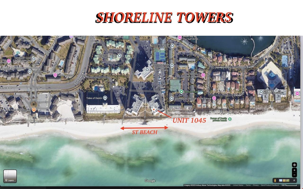 THIS IS THE DEAL YOU'VE WAITED FOR!500lf of pristine, private beach at your doorstep! Shoreline Towers is a landmark community in the heart of Destin that offers an unparalleled coastal lifestyle. This spacious 2-bedroom condo is your gateway to resort-style living. This resort boasts an impressive array of amenities designed for relaxation and recreation. Dive into the seasonally heated community pool, challenge friends to tennis or pickleball, or maintain your routine in the fitness center. Enjoy evenings at the BBQ/ picnic areas overlooking the serene community lake, or gather with friends and family in the spacious clubhouse. With 24/7 security in this gated community, peace of mind is always part of the experience.Shoreline Towers isn't just a place to stay; it's a Destin tradition. With its established history and reputation, this complex has been a sought-after destination for years, known for its exceptional location and well-maintained grounds. The recent multi-million dollar renovations ensure it's fortified and beautified for years to come.And the location? Simply perfect. Unit 1045 places you moments away from Destin's vibrant scene. Indulge in a diverse array of renowned restaurants, lively nightlife, and fantastic shopping - all within easy reach. Whether you're seeking a delicious seafood dinner, evening entertainment, or a day of retail therapy, the convenience is unmatched.