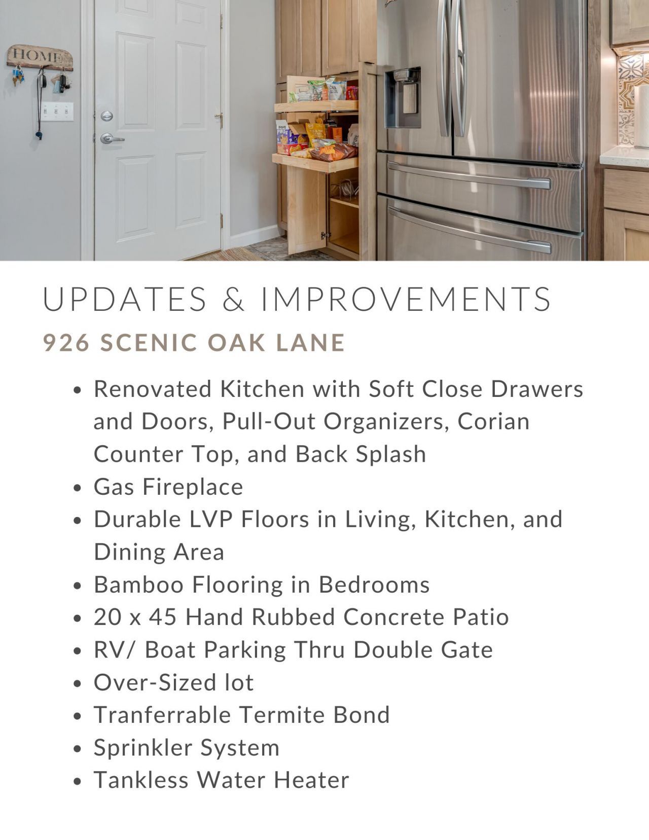 Welcome to this beautifully updated 3-bedroom, 2-bath home offering modern comfort and timeless style in a prime central location. Thoughtfully renovated inside and out, this home is truly move-in ready.Recent upgrades include a tankless water heater (2018), dimensional shingle roof (2018), and a brand-new HVAC system (2025) for peace of mind. Step inside to find upgraded LVP flooring flowing through the living, dining, and kitchen areas, creating a seamless and stylish look. Both bathrooms have also been tastefully updated for a fresh, modern feel.The kitchen is designed with both function and beauty in mind, featuring soft-close cabinets and drawers, a pantry with plenty of storage, and pull-out organizers in both the kitchen and pantry.Additional highlights in clude:Indoor laundry room for convenienceGas fireplace creating a warm, inviting living space20' x 40' hand-rubbed concrete patio perfect for entertaining or relaxing outdoorsDouble gate access on Pacific Silver Court for secure boat or RV parkingwith plenty of green lawn still remaining in the backyardLawn pump and sprinkler system to keep the yard thriving year-roundSituated on one of the largest lots in Oak Park Estates, providing extra space and privacyThis home combines thoughtful upgrades with a central location close to schools, shopping, dining, and the beach.