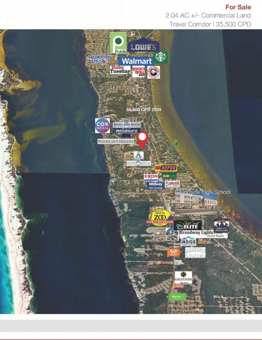 The property is located near several significant development projects and amenities.Positioned directly in front of a 15 acre tract designated for Santa Rosa County's new soccer complex project,which will include:NCAA regulation fields, urban soccer fields, and futsal courts. Concession/restroom facilities, parking lots, and playgrounds. Multi-use trails connecting the complex to nearby schools. Phase one construction is underway, with an estimated cost of $6M-$9M for the completedproject.Conveniently located less than 1.5 miles from the future $110M Soundside High School, set to open in 2025, which will serve over 1,800 students. A robust 5-mile radius population of 31,269 residents, with 854 businesses employing nearly 6,000 workers and generating over $1B in total annual sales (2024).High profile commercial land parcel on main thoroughfare, busy commuter/trade corridor of Hwy 98. The parcel enjoys the favorable HCD zoning on the front 2 parcels. Maximum visibility with 500 feet of frontage on Hwy 98 with over 35,500 cars per day.